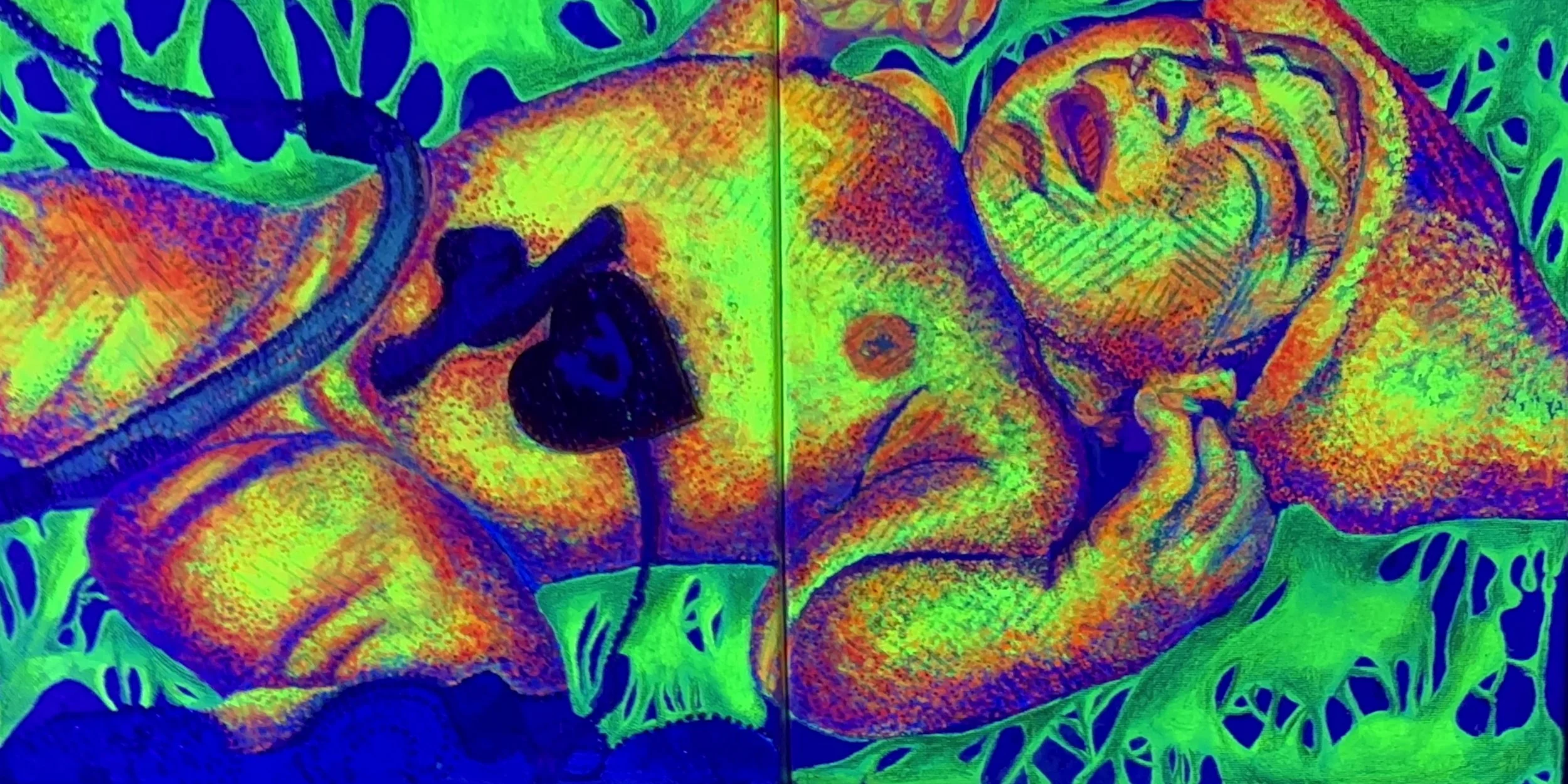 In my Artwork I use UV reactive-neon paint and the whole light spectrum to play with perspective.I create an image using dots and color theory.